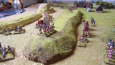 Anyway just for a change of pace we have been doing a bit of what I shall call, for want of a better term, Old School Gaming. That is to say we used simply painted 30mm figures with a version of the 1960's ruleset 'Charge or How to Play Wargames'. I always enjoyed the Charge rules having been introduced to the m by Dad when I was a nipper; he believing there should be some regulation to my games of soldiers thus starting me down the slippery slope! However, when using the rules recently I found them to be a bit bloody and I felt that for French Revolutionary battles they needed to cover morale so I wrote my own version. As it turned out I hadn't really thought them through very well (this happens a lot with my own rules) and the game was a bit hit and miss but here are some pictures: